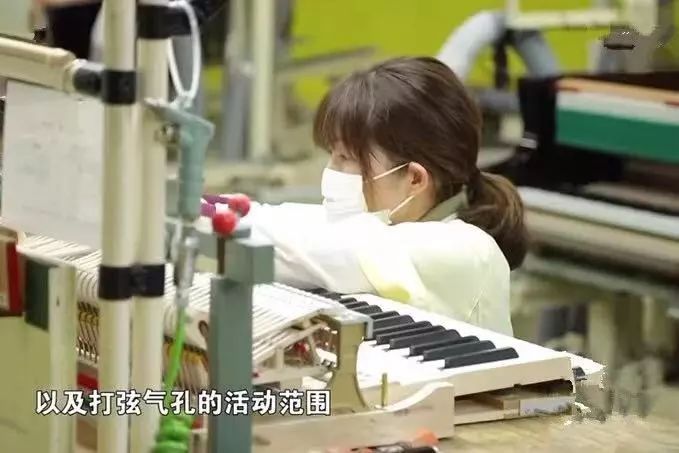 雅马哈乐器钢琴生产资深工程师井上敏带着我们参观了雅马哈钢琴的生产过程。这边主要在做两道工序,靠近过道的这条生产线是在调整键盘以及打弦气孔的活动范围,最重要的是:一台钢琴共有88个键,我们需要把所有键的位置都调整齐。